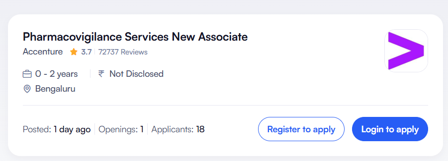 This role is an excellent entry point into pharmacovigilance for fresh graduates. Candidates will gain hands-on experience in adverse event reporting, safety databases, and regulatory compliance. Working with Accenture provides exposure to global pharmaceutical clients and opens career pathways into advanced drug safety, clinical research, and regulatory roles.