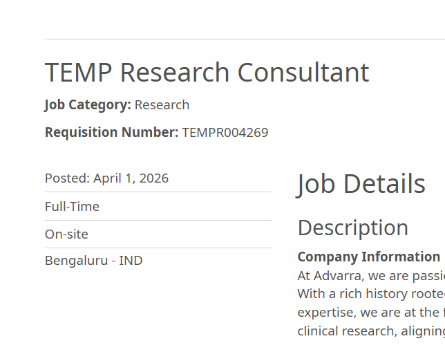 Advarra Research Consultant job 2026 in Bengaluru for freshers. Apply for clinical research role with strong learning and growth opportunities.