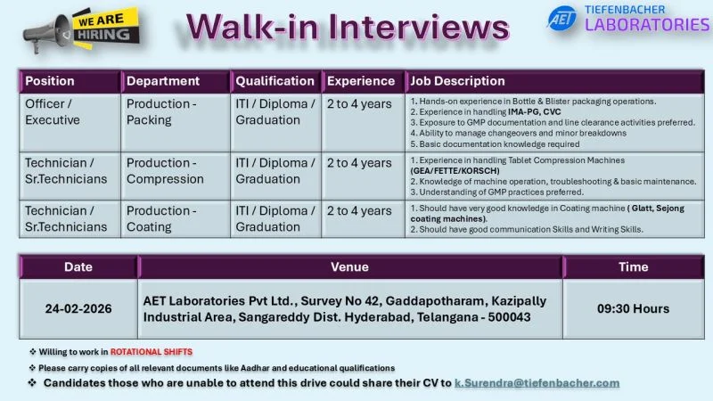 AET Laboratories has announced a walk-in recruitment drive for Production Officer and Technician roles at its manufacturing facility near Hyderabad. This hiring initiative is aimed at candidates with hands-on experience in pharmaceutical production, especially in solid oral dosage manufacturing. The walk-in is scheduled for February 2026 and offers an excellent opportunity for skilled production professionals to join a globally connected pharmaceutical organization.