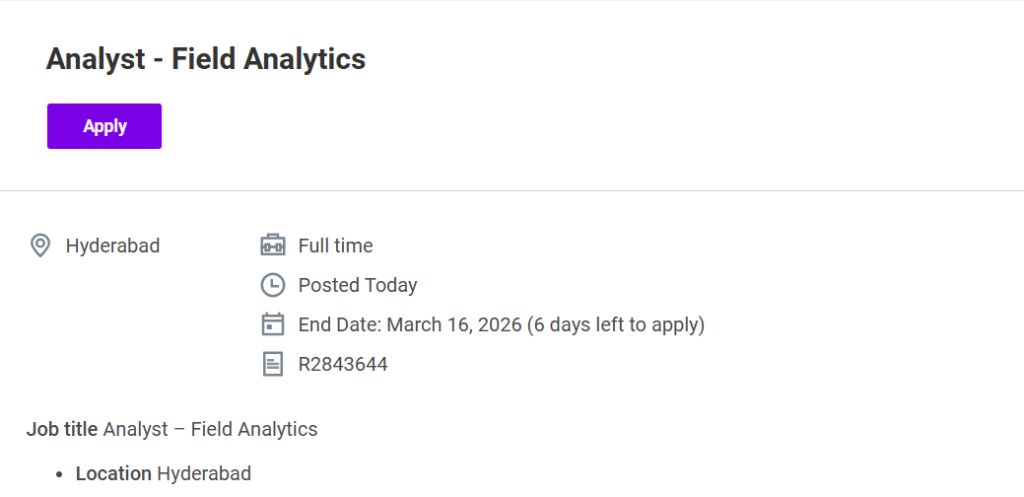 The salary for the Analyst – Field Analytics position will be as per company norms and based on the candidate’s qualifications, experience, and technical skills.