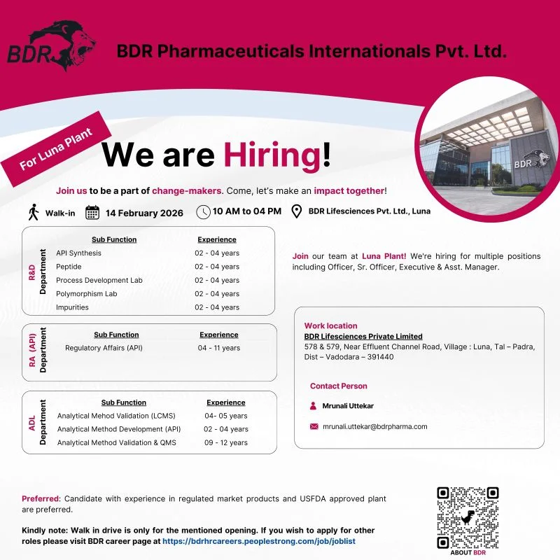 Experienced pharmaceutical professionals seeking growth in API research, analytical sciences, or regulatory affairs now have a promising opportunity in Gujarat. BDR Pharmaceuticals International Pvt. Ltd. is conducting a walk-in interview for multiple technical and regulatory roles at its Luna manufacturing plant near Vadodara. API RD AD Regulatory Affairs Jobs in Gujarat