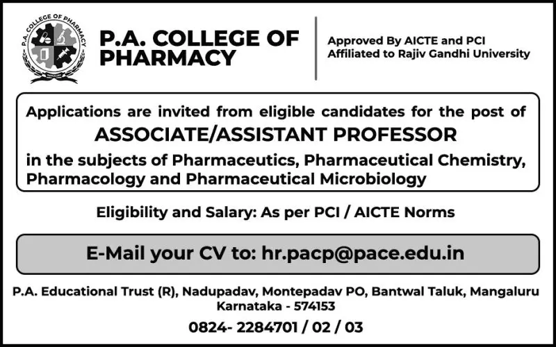 Assistant Professor Associate Professor Jobs in Pharmacy at P.A. College of Pharmacy