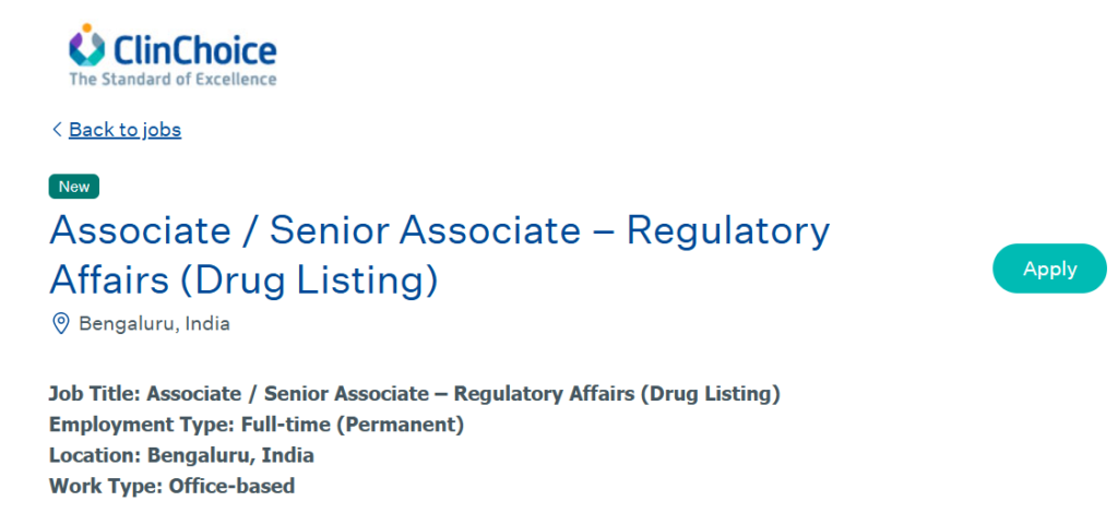 Associate Senior Associate Regulatory Affairs Bengaluru Pharma Jobs at ClinChoice