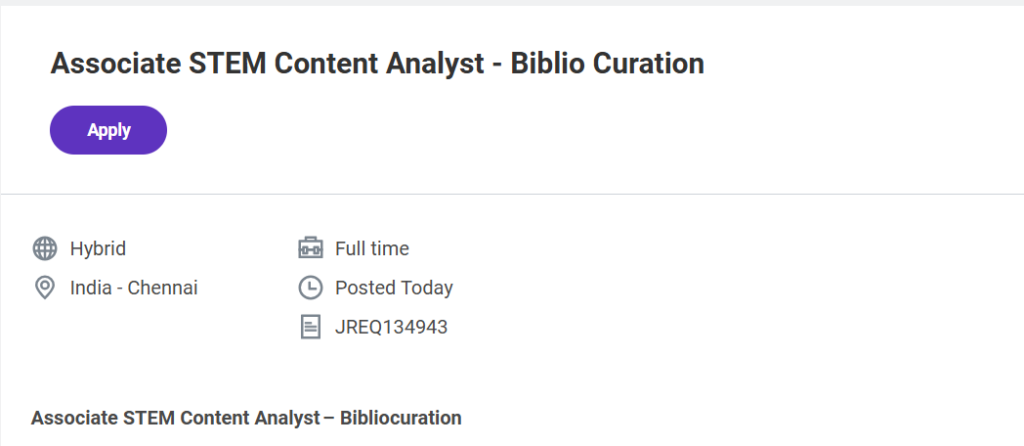 | Job Role | Associate STEM Content Analyst – Bibliocuration |