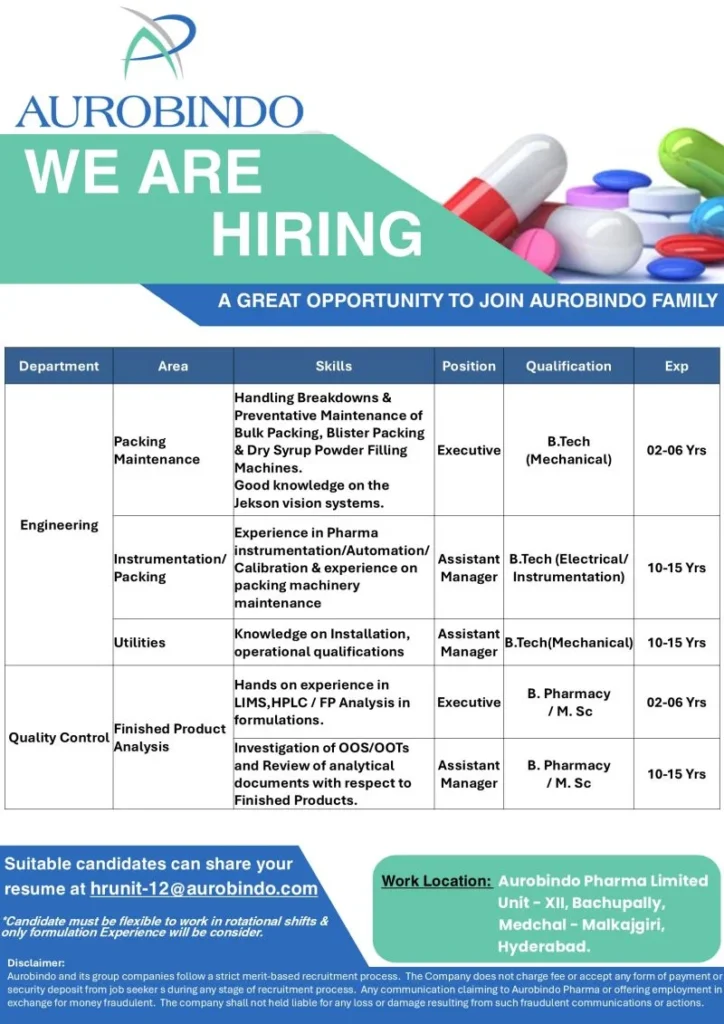 Candidates with strong formulation plant exposure and relevant machinery experience are more likely to be shortlisted. Aurobindo Pharma Hiring Engineering QC Jobs