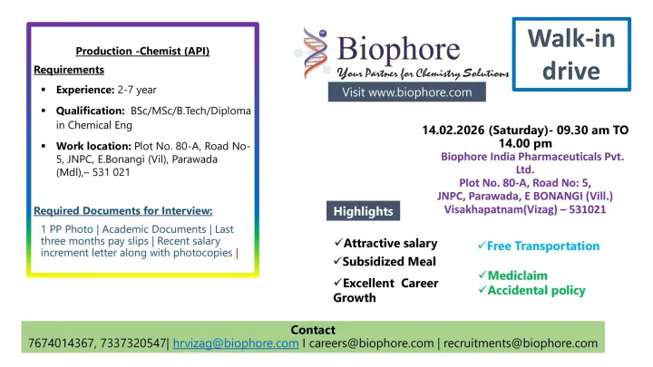 If you have relevant experience in API production and are ready to advance your career in pharmaceutical manufacturing, attend the walk-in interview on 14 February 2026 in Visakhapatnam. Carry all required documents and ensure timely reporting for smooth participation in the recruitment process. Biophore India Hiring Production Chemist