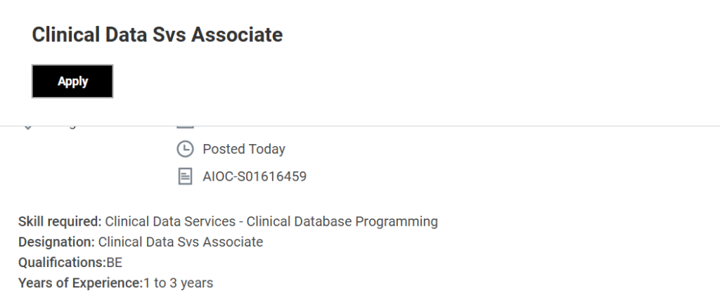 IndiaPharmaJobs.in is an independent job information platform and is not affiliated with Accenture or any organization mentioned above. We do not charge any fees for job postings or applications. Candidates are advised to verify all details from the official company website before applying. Clinical Data Programming Associate Job at Accenture