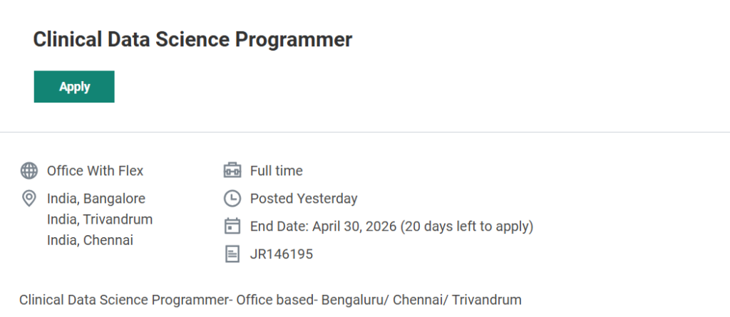 Candidates can apply through the official online application portal. Make sure your resume highlights your programming skills and clinical data experience.