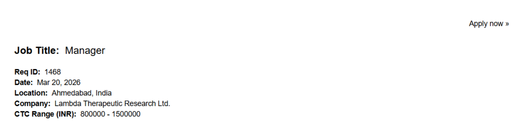 IndiaPharmaJobs.in is an independent job information platform and is not affiliated with Lambda Therapeutic Research Ltd. or any company. We do not charge any fees for job postings or applications. Candidates are advised to verify job details from the official company website before applying. Clinical Research Manager Job at Lambda Therapeutic Research