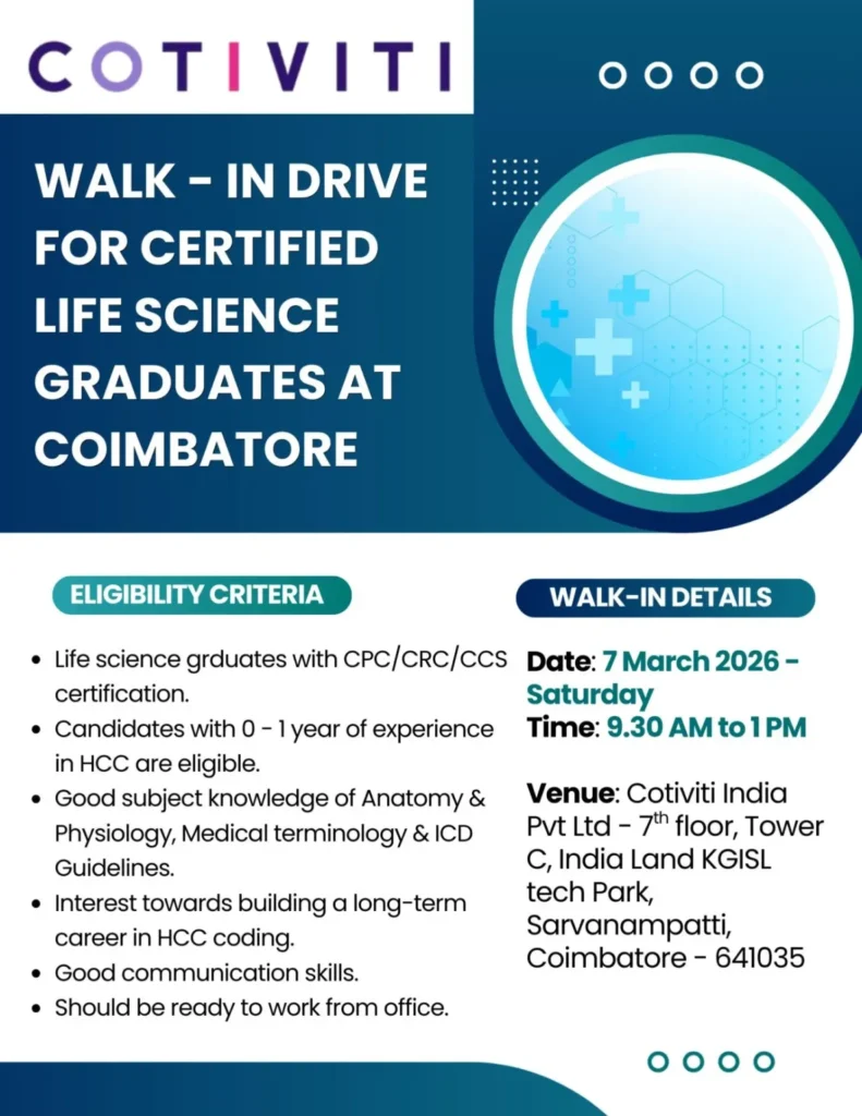 Life Science graduates looking to enter the growing healthcare analytics sector have an excellent opportunity in Coimbatore. Cotiviti is organizing a walk-in recruitment drive for certified candidates interested in HCC Medical Coding roles. This hiring drive is specifically aimed at freshers and professionals with up to one year of experience who hold valid medical coding certifications.