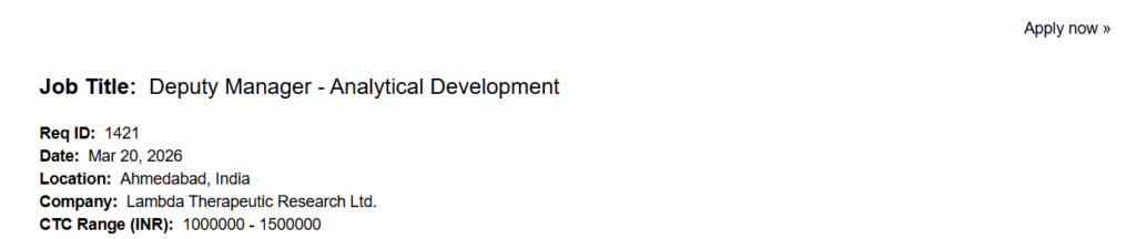 IndiaPharmaJobs.in is an independent job information platform and is not affiliated with Lambda Therapeutic Research Ltd. or any company. We do not charge any fees for job postings or applications. Candidates are advised to verify all job details from the official company website before applying. Deputy Manager Job at Lambda Therapeutic Research