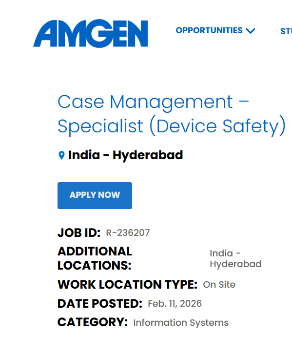 IndiaPharmaJobs.in is an independent job information platform that shares employment opportunities for informational purposes only. We are not affiliated with Amgen or its recruitment team. Candidates are advised to verify all job details directly from the official company website before applying. We do not charge any fee for job postings or applications. Device Safety Case Management Specialist Job in Hyderabad at Amgen