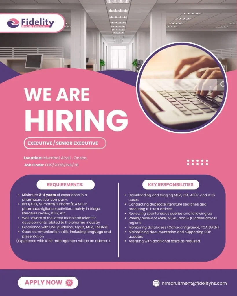 Are you aiming to grow your career in pharmacovigilance and drug safety? Fidelity Health Services is currently hiring skilled professionals for Drug Safety Executive and Senior Executive roles at its Airoli, Mumbai location. This opportunity is well-suited for candidates with hands-on experience in ICSR processing, literature review, and global safety database management.
