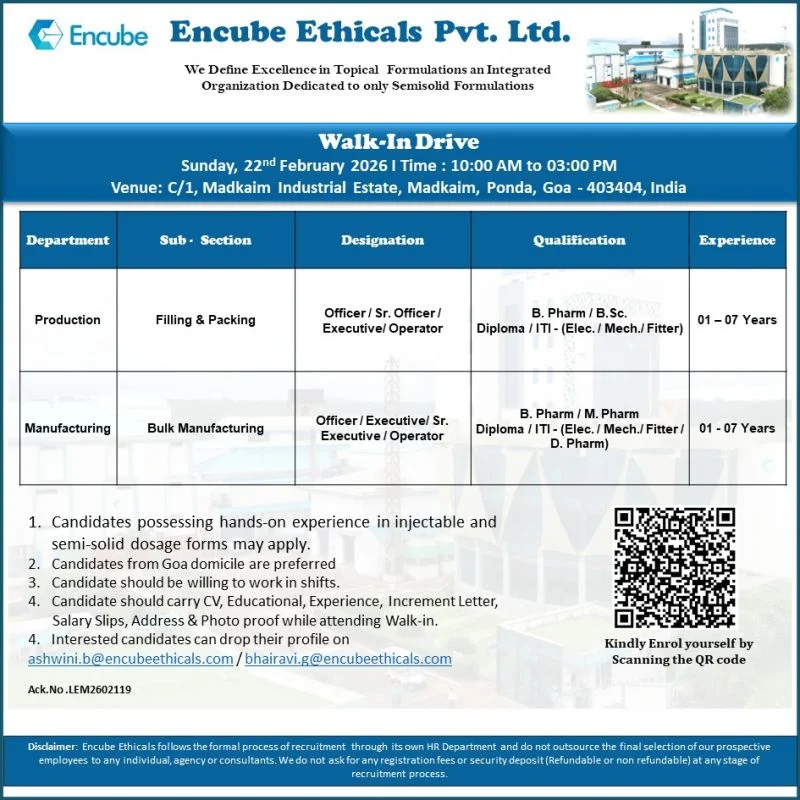 Pharma professionals looking for production and manufacturing jobs in Goa have an excellent opportunity. Encube Ethicals Pvt. Ltd. is conducting a walk-in interview drive for multiple roles in Production and Manufacturing departments. Candidates with experience in semisolid and injectable formulations are encouraged to attend this hiring event.