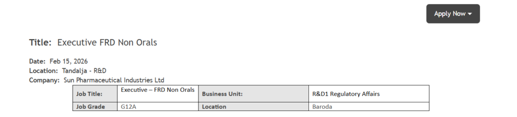 IndiaPharmaJobs.in is an independent job information platform that provides verified pharmaceutical and life sciences career updates. We are not affiliated with Sun Pharmaceutical Industries Ltd or its hiring processes. Applicants are advised to verify details through official company sources before applying. We do not charge any fees for job listings or applications. Executive FRD Non Orals Job at Sun Pharma