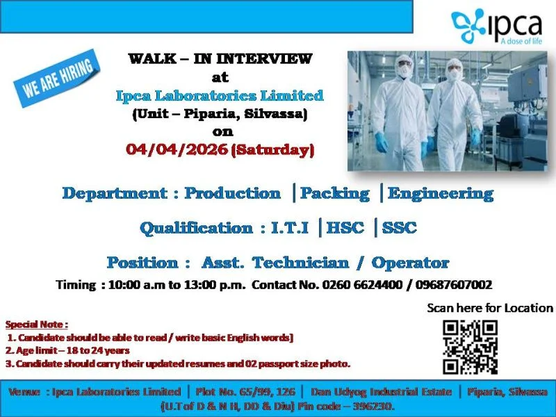 IndiaPharmaJobs.in is an independent job information platform and is not affiliated with Ipca Laboratories Limited or any employer mentioned. Candidates are advised to verify details before attending the interview. We do not charge any fees for job postings or applications.