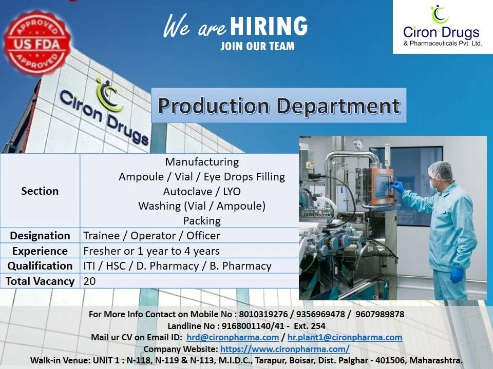 Ciron Drugs hiring freshers for production manufacturing roles. Check eligibility, vacancies, location, and apply for pharma jobs in Maharashtra now.