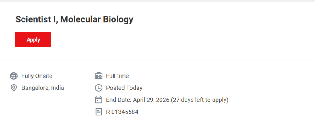 This position offers an excellent opportunity for candidates interested in molecular biology and antibody research. Working with Thermo Fisher Scientific provides access to advanced technologies and global research exposure. The role is ideal for freshers and early-career professionals who want to build expertise in antibody engineering, molecular biology techniques, and bioinformatics.