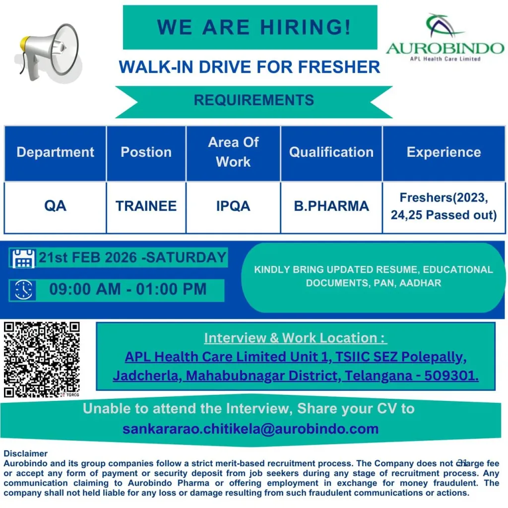 IndiaPharmaJobs.in is an independent job information platform and is not affiliated with APL Health Care Limited or the Aurobindo Group. We provide job updates for informational purposes only. Candidates should verify details independently and avoid paying any fees during the recruitment process. Freshers Jobs at Aurobindo Group for QA Trainee