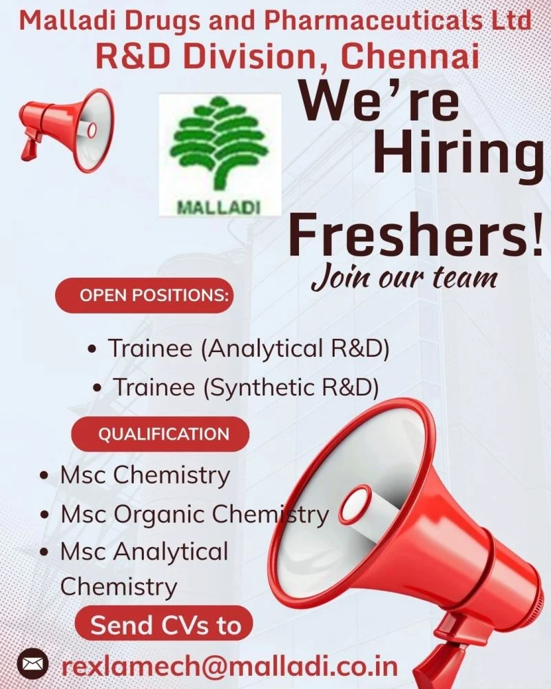 Fresh postgraduates in Chemistry looking to enter the pharmaceutical research field now have an excellent opportunity in Chennai. Malladi Drugs and Pharmaceuticals Ltd has announced trainee openings in its Research & Development division for enthusiastic MSc graduates.