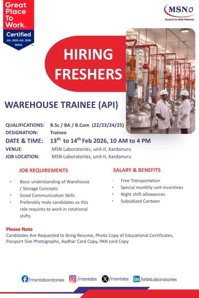 Freshers Jobs for Warehouse Production QC Microbiology at MSN Laboratories in Patancheru. Walk-in 13-14 February 2026.