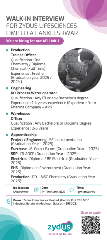 Zydus Lifesciences is one of Indiaβs most respected pharmaceutical organizations, known for its strong presence in active pharmaceutical ingredient (API) manufacturing and life-science innovation. The company operates with a sharp focus on quality systems, regulatory compliance, and continuous improvement across its manufacturing units. With decades of industry experience, Zydus has built a work culture that supports learning, technical excellence, and long-term career development, making it a preferred employer for young pharma professionals.