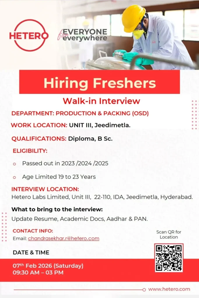 Freshers Jobs Production Packing at Hetero Labs OSD roles in Hyderabad through walk-in interview February 2026.