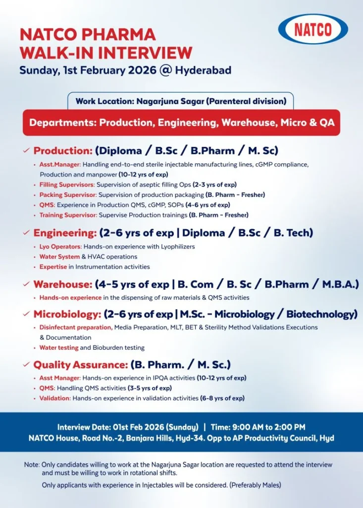 Natco Pharma Limited has announced a major walk-in interview drive in February 2026 for its Parenteral (Injectables) manufacturing division. The company is inviting applications from freshers as well as experienced pharmaceutical professionals for multiple roles across Production, Quality Assurance, Engineering, Warehouse, and Microbiology functions. Freshers Jobs Production QA Engineering