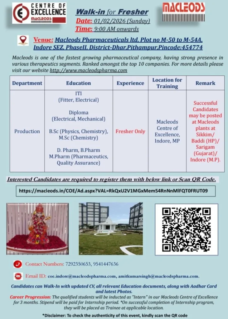 IndiaPharmaJobs.in is an independent pharmaceutical job information platform. We do not represent or recruit on behalf of Macleods Pharmaceuticals. Job details are shared strictly for informational purposes. Candidates are advised to verify all information directly with the company before attending the interview. Freshers Jobs Production Trainee Jobs