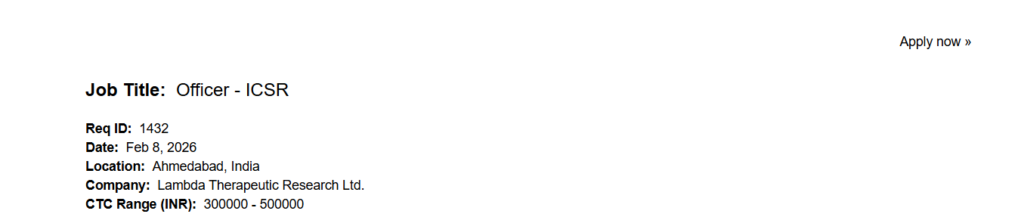 IndiaPharmaJobs.in is an independent job information platform and is not affiliated with Lambda Therapeutic Research Ltd. or its recruitment partners. Job details are shared strictly for informational purposes. Candidates should verify all information directly from official company sources before applying. Freshers Officer ICSR Jobs in Ahmedabad