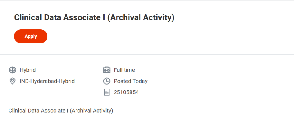Interested candidates should apply through the official Syneos Health careers portal using the job requisition ID mentioned in the listing. Highlight your clinical data management experience and archival exposure in your resume for better chances. Syneos Health Hiring Clinical Data Associate I Job