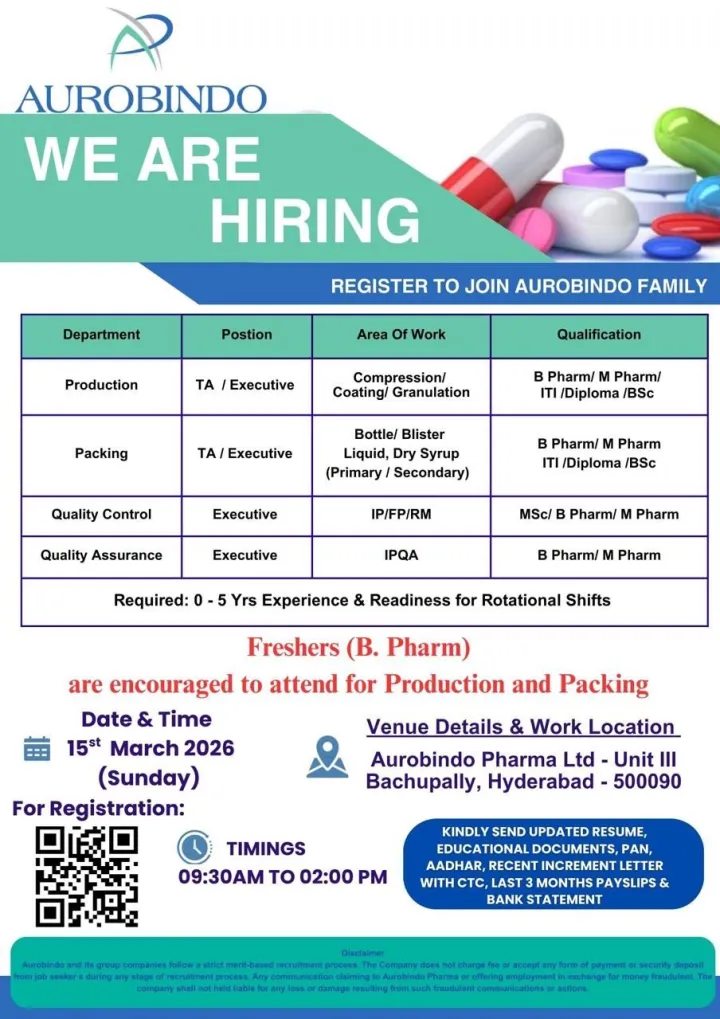 Applicants should arrive early with all required documents to ensure smooth participation in the recruitment process. Candidates may also register by scanning the QR code provided in the official recruitment notice. Aurobindo Pharma Hiring for Freshers Production Packing QC QA Jobs