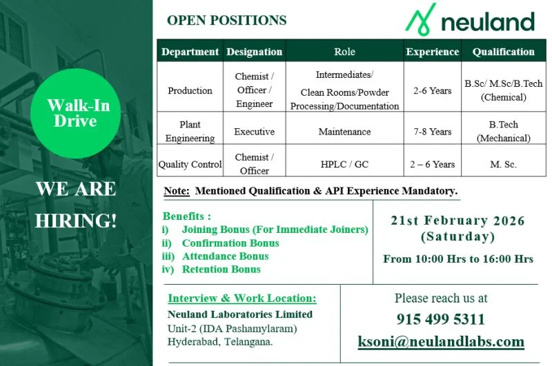 IndiaPharmaJobs.in is an independent job information website that shares verified pharma career updates for informational purposes only. We are not directly associated with Neuland Laboratories or its recruitment partners. Applicants are advised to verify details through official company sources before attending the walk-in interview. We do not charge any fees for job information. Hiring for Production Engineering QC Roles