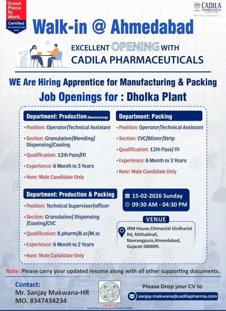 These roles are designed for candidates seeking practical exposure in regulated pharmaceutical manufacturing environments. Cadila Pharmaceuticals Hiring for Production Packing