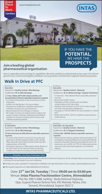 India’s injectable and biotech pharmaceutical sector continues to expand rapidly, creating consistent demand for skilled Quality Control professionals. For candidates with experience in microbiology testing, chemical analysis, and cGMP-regulated environments, a walk-in opportunity at a reputed pharmaceutical major can be a decisive career move. Intas Pharmaceuticals is now strengthening its Quality Control teams and inviting experienced professionals to join its advanced injectable and biotech manufacturing operations in Ahmedabad. Hiring for QC Executive Microbiology Chemical