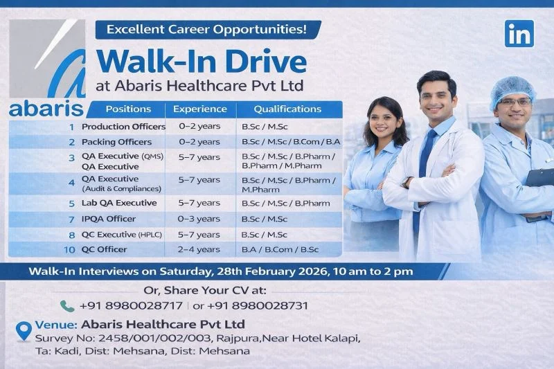 Abaris Healthcare Pvt. Ltd. has announced a major walk-in recruitment drive for multiple pharmaceutical manufacturing roles in Gujarat. The company is inviting freshers and experienced candidates for Production, Quality Assurance (QA), Quality Control (QC), and Packing departments. Scheduled for 28th February 2026, this walk-in drive provides a direct opportunity for candidates to secure jobs in the pharma manufacturing sector without lengthy hiring procedures. Abaris Healthcare Hiring Freshers for Production QA QC Packing Job