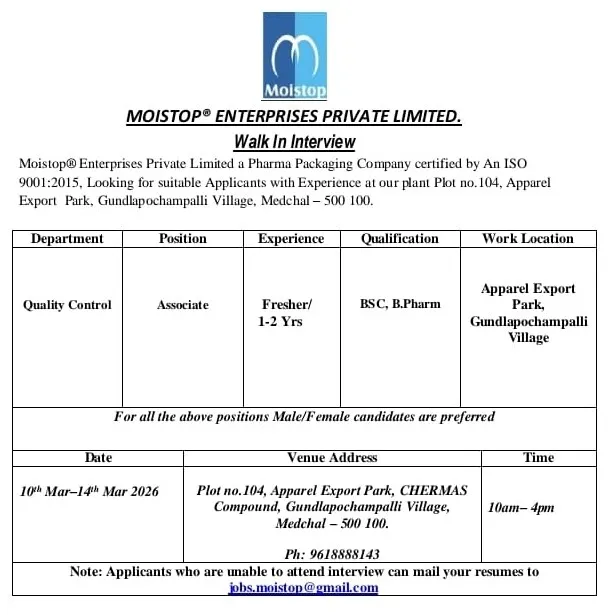 Moistop Enterprises Hiring Freshers for QC Associate in Medchal for BSc and B.Pharm freshers with walk-in interviews from 10–14 March.