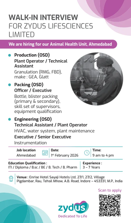 Zydus Lifesciences Limited has announced a walk-in interview drive in February 2026 for experienced pharmaceutical professionals to join its Animal Health manufacturing unit in Ahmedabad, Gujarat. The company is hiring skilled candidates across OSD Production, OSD Packing, and Engineering & Maintenance functions.