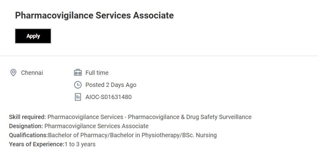 | Job Role | Pharmacovigilance Services Associate |