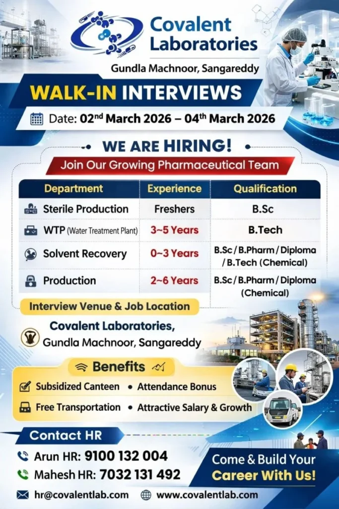 Additionally, the Telangana pharma belt continues to attract major investments, offering long-term career stability and growth opportunities for manufacturing professionals. Covalent Laboratories Hiring Production WTP Solvent Recovery Jobs