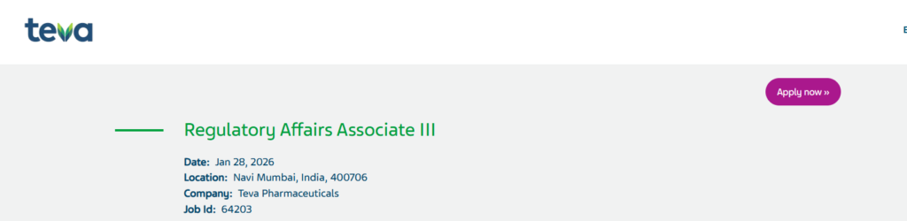 Interested candidates can apply through the official Teva careers portal by searching: Teva Pharmaceuticals Hiring Regulatory Affairs Associate III