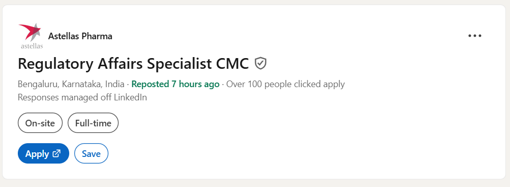 IndiaPharmaJobs.in is an independent job information platform that shares pharmaceutical and life sciences job updates for informational purposes only. We are not affiliated with Astellas Pharma or any organization mentioned in this post. Candidates should verify job details on the official company website before applying. IndiaPharmaJobs.in does not charge any fee for job information. Astellas Pharma Hiring Regulatory Affairs Specialist CMC