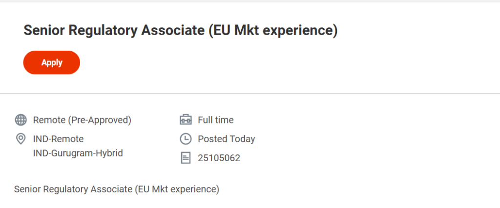 • Job Title: Senior Regulatory Associate (EU Market Experience)