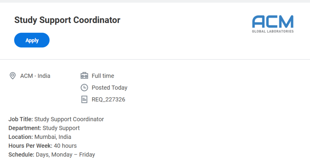 A new opportunity has opened in Mumbai for life sciences graduates who are interested in building a career in clinical research and clinical trial operations. ACM Global Laboratories is inviting applications for the position of Study Support Coordinator within its Clinical Trials Study Management team. This role provides structured exposure to global clinical trials, central laboratory coordination, and regulated research environments, making it suitable for both freshers and early-career professionals.