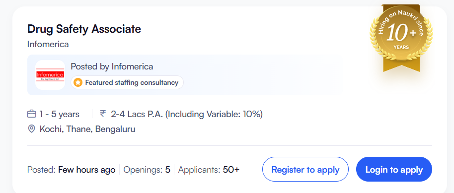 The pharmacovigilance sector continues to generate strong demand for skilled case processing professionals. Infomerica, a reputed staffing and consulting firm in the IT and healthcare space, is currently recruiting Drug Safety Associates for its client operations supporting global pharmacovigilance programs.