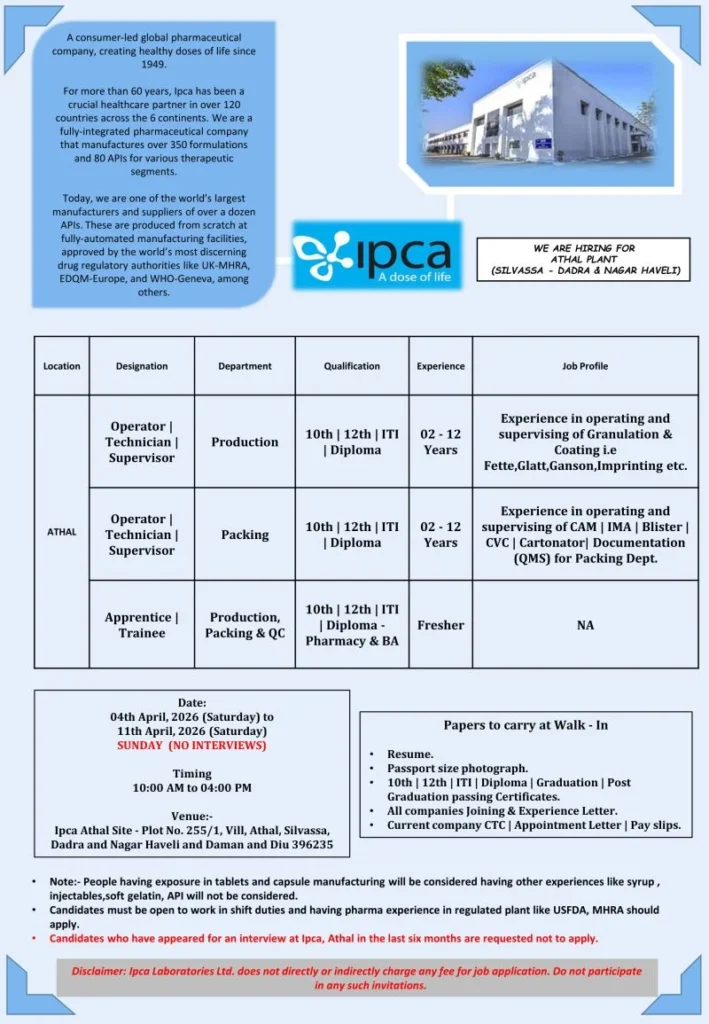 Freshers and experienced candidates looking for pharma manufacturing jobs can explore a strong opportunity with Ipca Laboratories Ltd. The company is conducting a walk-in drive at its Athal (Silvassa) facility for Production, Packing, and Quality Control roles.