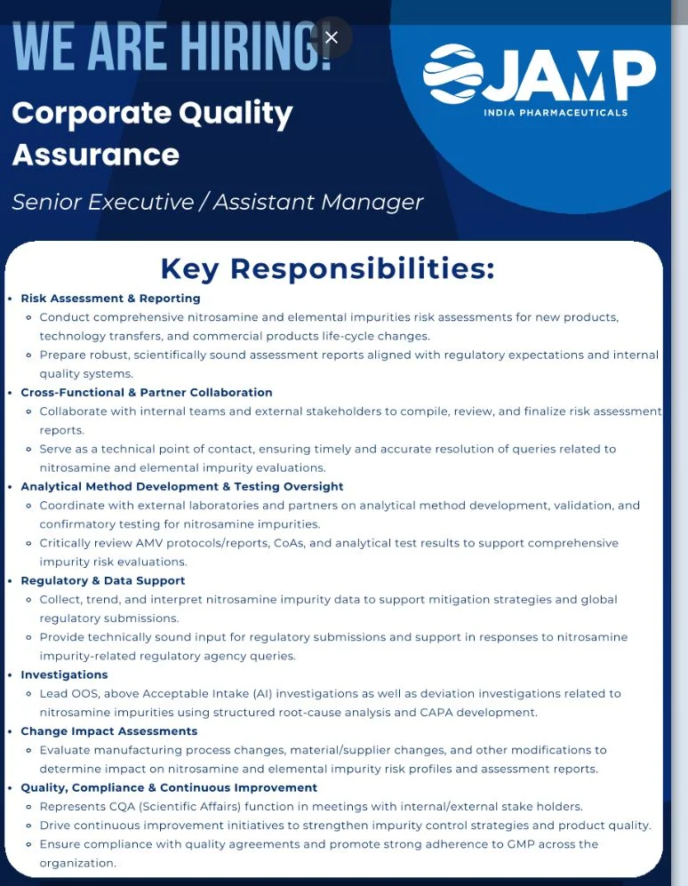 This opportunity offers a strong platform for professionals interested in pharmaceutical quality assurance and regulatory compliance. Working with JAMP Pharma provides exposure to advanced impurity risk assessment strategies and international regulatory requirements.