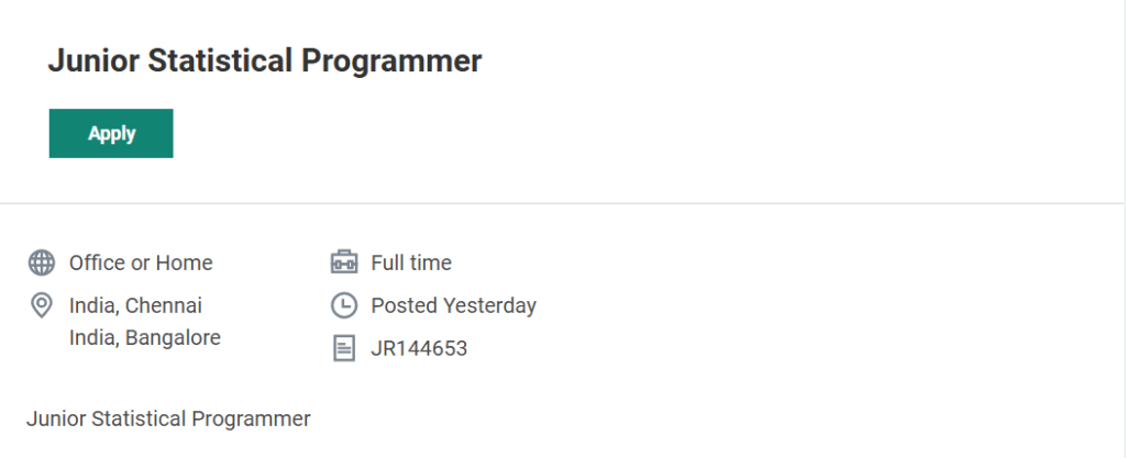 If you meet the eligibility criteria and possess the required programming skills, submit your application soon and take the next step toward a rewarding career in the pharmaceutical and healthcare research industry. Junior Statistical Programmer Job at ICON plc
