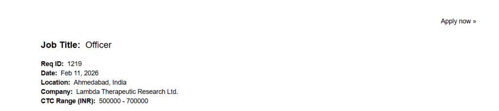 Interested and eligible candidates should apply through the official career portal of Lambda Therapeutic Research Ltd. Candidates are advised to search for the position using the Req ID: 1219 while submitting their application.