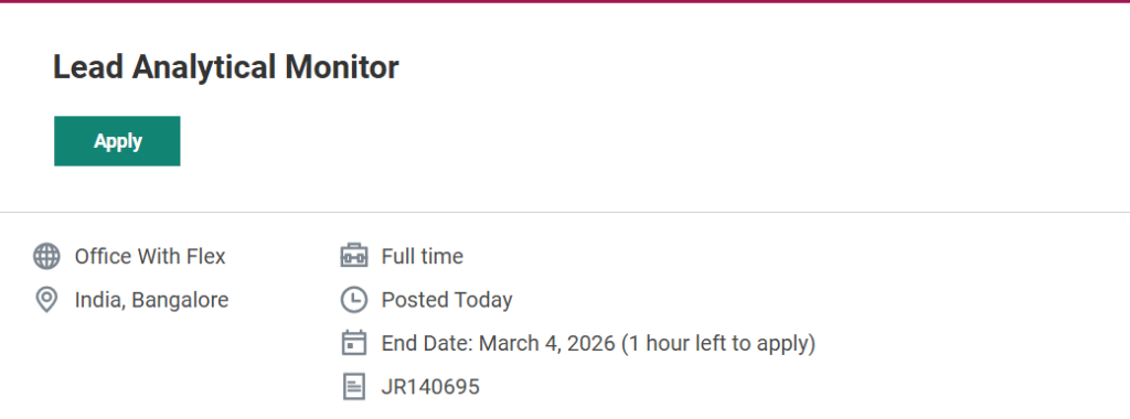 Interested professionals should apply online through the official ICON careers portal using Job Requisition ID JR140695. Given the short time remaining before the deadline, immediate application is strongly recommended. Lead Analytical Monitor Job in Bangalore at ICON plc